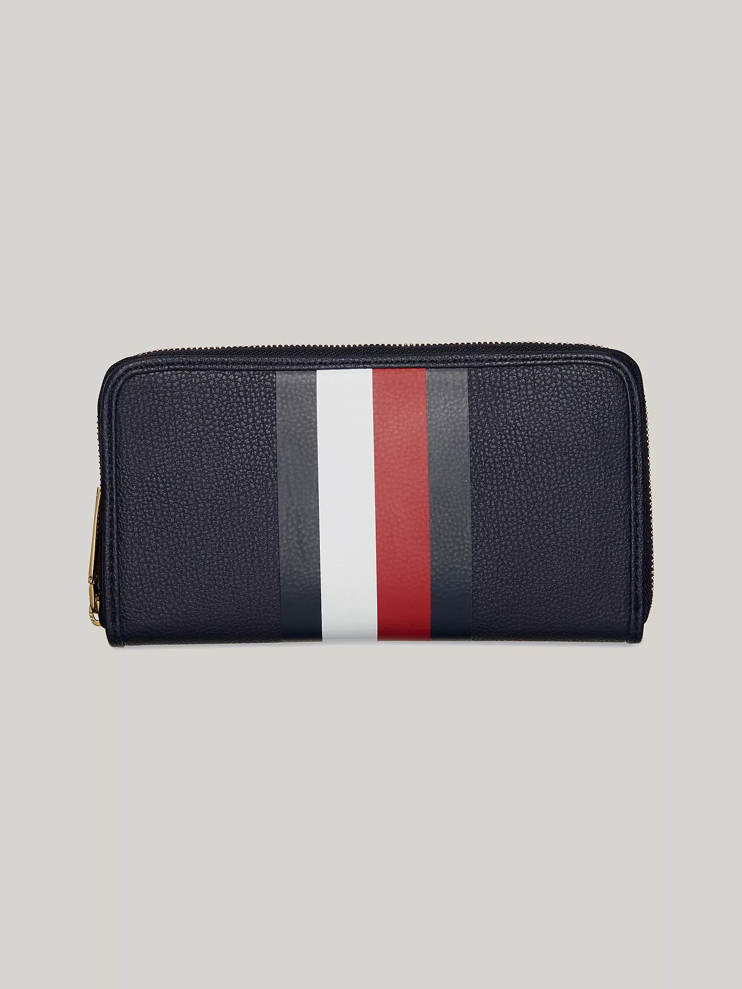 Tommy Hilfiger women's wallet. Finished with our signature stripes, this large wallet features a zip-around closure giving you easy access to cards and cash.