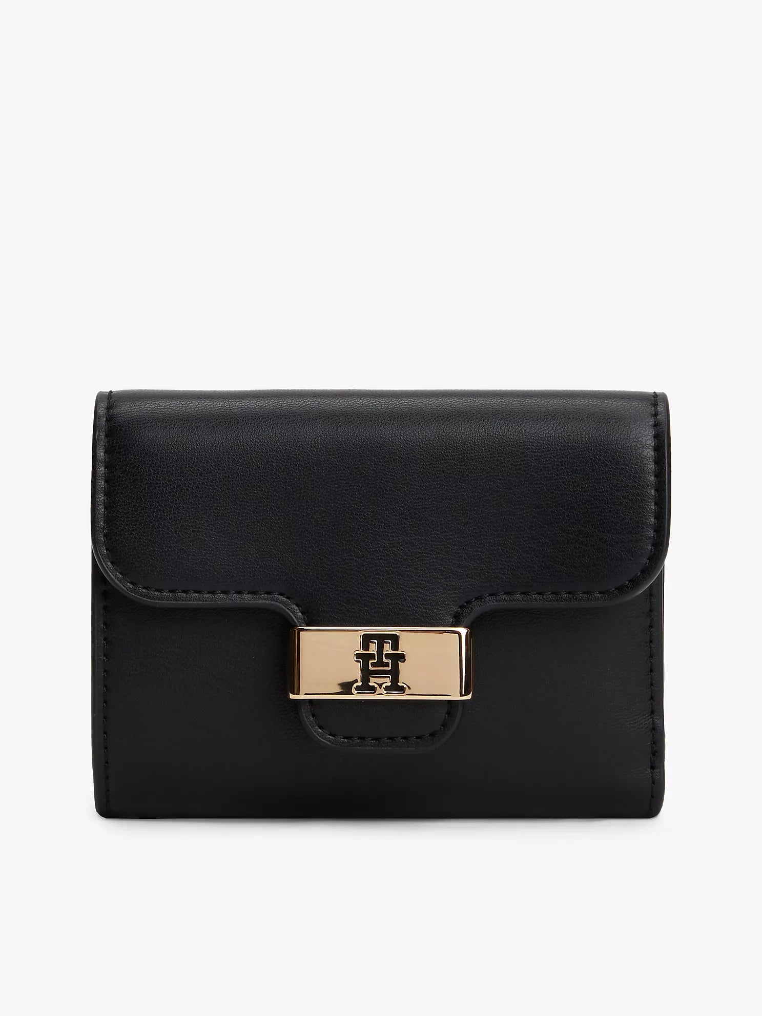 Tommy Hilfiger women's wallet. This smooth trifold wallet is a sleek and stylish choice that slips effortlessly into any bag. It's equipped with card and currency slots and a zipped coin pouch.