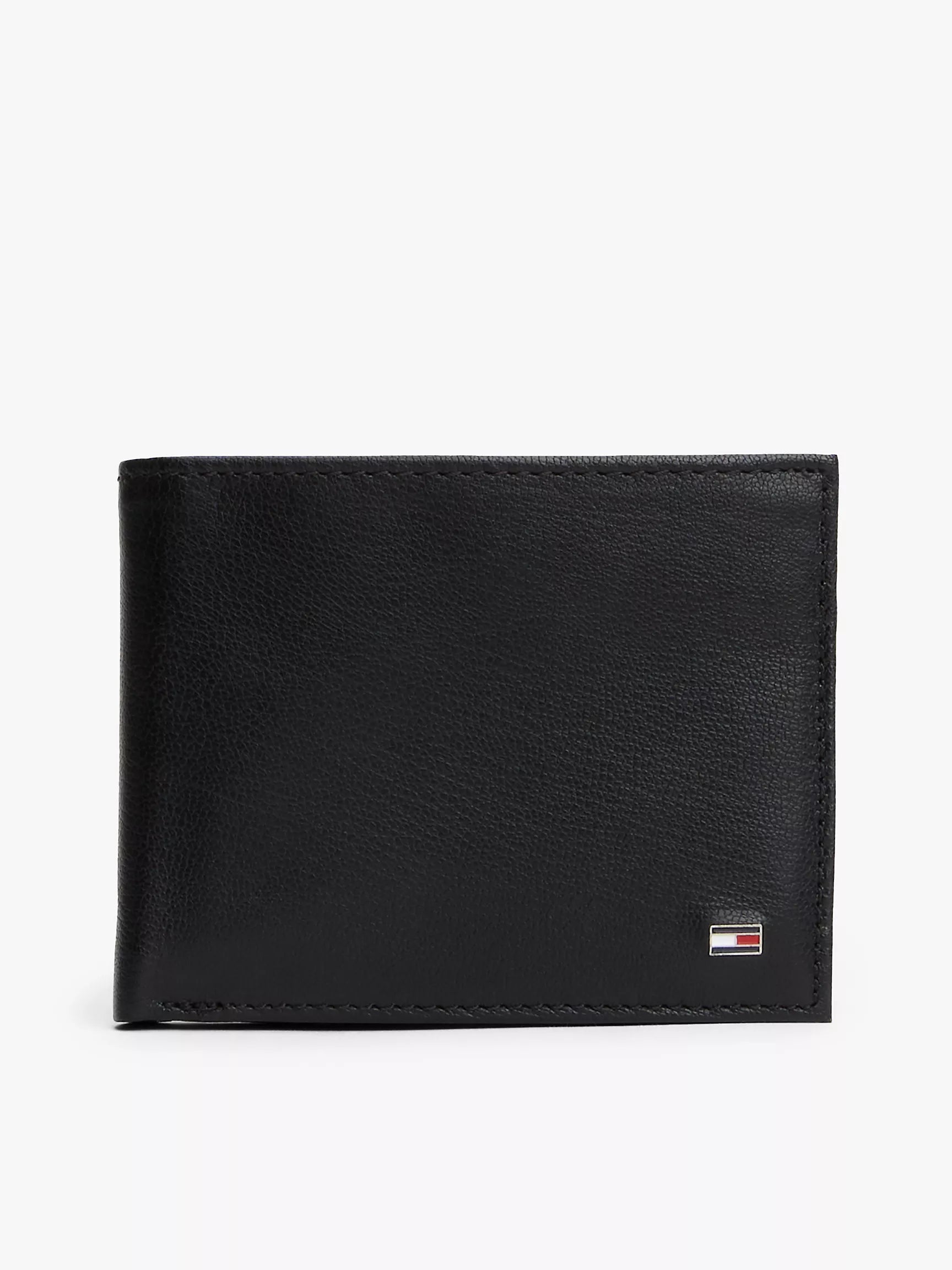 Tommy Hilfiger men's wallet. This refined card and currency wallet is made from pebbled leather and finished with our signature enamel flag on the front. It features secure, transparent slots to house your ID and other important cards.